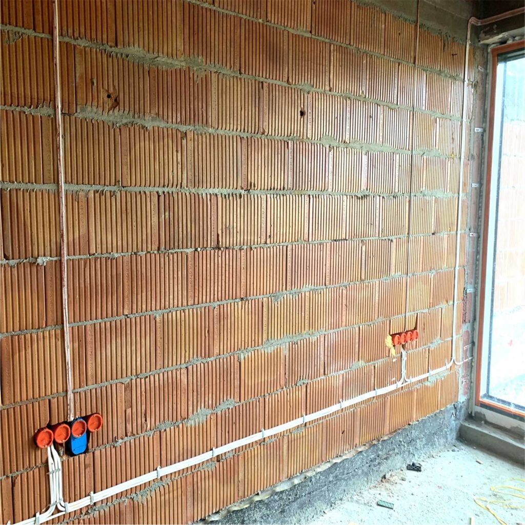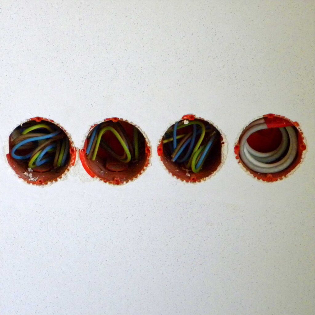 Otwory do osadzania puszek są wykonane bardzo starannie i równo przy pomocy promienia lasera specjalną koronką wiertniczą. Pozostaje jednak mały margines luzu na ewentualne korekty. Oczyszczone są z kurzu i gruzu aby ułatwić ich późniejsze otynkowanie. Przewody są obrane, schowane do środka, a wszystkie puszki są zakryte specjalnymi deklami ochronnymi aby podczas tynkowania nie uległy zabrudzeniu.