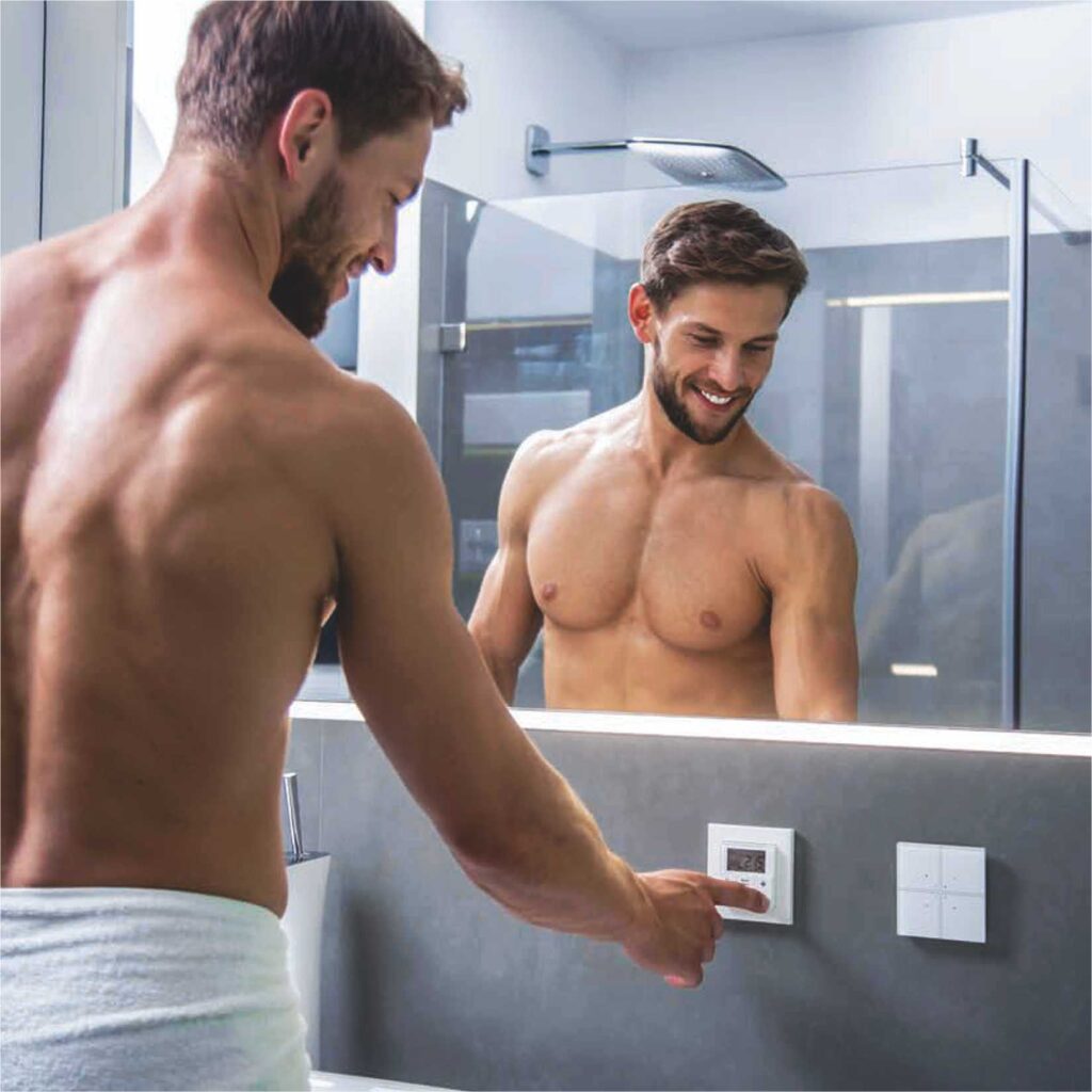 Temperatura w pomieszczeniach utrzymywana jest automatycznie w zależności od pory dnia lub obecności domowników. Dzięki scenom świetlnym mamy nastrój adekwatny do samopoczucia lub do czynności takich, jak oglądanie TV, wspólny obiad, wypoczynek czy zabawa. Komunikacja Bluetooth zapewnia łączność z systemem przez „komórkę” z dowolnego miejsca w domu. Specjalna aplikacja na Twój osobisty telefon pokieruje wszystkimi funkcjami. O zmierzchu oświetlenie ogrodu załączy się, a rolety samoczynnie się zamkną. Sterowanie centralne pozwoli przy wyjściu jednym przyciśnięciem wyłączyć wszystkie światła i odbiorniki w całym domu, a rolety automatycznie się opuszczą pozostawiając dom bezpieczny.