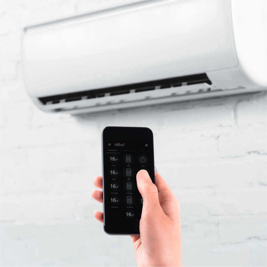 Inteligentne sterowanie klimatyzacją zapewnia komfort dopasowany do Twojego rytmu dnia. System planuje pracę urządzeń automatycznie, umożliwia zdalne chłodzenie przed powrotem do domu oraz wyłącza klimatyzację podczas nieobecności, ograniczając zużycie energii.